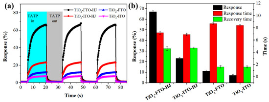 The gas sensing performance diagram of TiO2–FTO–HJ, TiO2–ITO–HJ, TiO2–FTO and TiO2–ITO to TATP vapors was evaluated under simulated natural light [29]. One can see from Figure 10a that the response of TiO2–FTO–HJ to TATP vapors is nearly three times as strong as the response of TiO2 –ITO–HJ to TATP. TiO2–FTO and TiO2-ITO also respond to TATP vapors, but the response is weak compared with that of homojunction structure. As shown in Figure 10b, the responses of TiO2–FTO–HJ, TiO2 –ITO–HJ, TiO2–FTO and TiO2–ITO to TATP vapors were about 67%, 23%, 11% and 7%, respectively. Moreover, TiO2–FTO–HJ showed a quick response time to TATP of 7.2 s and a recovery time of 4.9 s (Figure 10b). This can be attributed to the homojunctions formation between the urchin-shaped TiO2 and TiO2 nanoarrays, which may be beneficial in promoting the efficient separation of photogenerated charges.