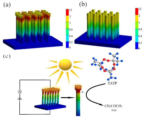 As a demonstration, E-field intensity distributions of TiO2 homojunction and TiO2 nanoarrays were simulated by finite element method. Figure 11a shows the electric field distributions of TiO2 homojunction. The hot spot area can be found between the interface of urchin-shaped TiO2 nanosphere and TiO2 nanoarrays. Compared with the simulation results of the urchin-free nanosphere shown in Figure 11b, the strength of the electromagnetic fields of the TiO2 homojunction at the hot spot area increase at least six orders of magnitude with respect to the TiO2 nanoarrays. This demonstrates that the interface of the urchin-shaped TiO2 nanosphere and TiO2 nanoarrays can enhance the localized electromagnetic fields intensity to a certain extent under the simulated natural light. Thus, the photoelectrons accumulate at the interface of the homojunction to provide photocatalysis active site to reduce TATP to acetone and hydrogen peroxide (Figure 11c).