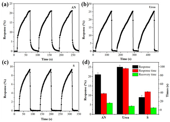 Time-dependent response of the TiO2–FTO–HJ in room-temperature to saturated AN (a), urea (b) and S (c) vapor and corresponding response time and recovery time (d).