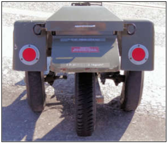 Pavement friction was measured by a Mu-meter. This is a small trailer towed by a car or van; see Figure 3. It had two measuring tires with 100 mm wide non-patterned (smooth) tread separated approximately 0.7 m with a toe-out of 15°. This means that the forces on these tires were side forces, which are measured by a load-cell. The Mu-meter is mostly used on airport runways, but nothing prevents it from working equally well on road pavements. The test speeds were 40, 60, and 80 km/h, and a minimum of five runs was made per each test location and speed. Water was sprayed on the surface from a nozzle in front of the tires, simulating a water depth of 1 mm. The output is a side force coefficient (SFC), which was recorded every 1 m, and the mean SFC over 100 m was calculated as the reported value for each test location. No temperature correction was made to SFC. It is generally assumed that the Mu-meter was sensitive to the macrotexture influence on friction, by a combination of drainage, which helped removing water from the tire/surface contact and by hysteresis losses. This is due to the relatively high speeds, relatively high water depth and the smooth non-patterned tires.