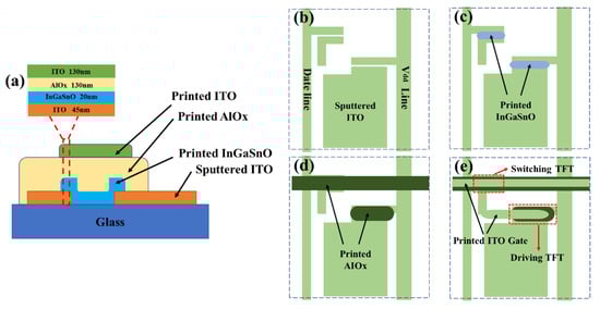 (a) Structural diagram of the printed top-gate MO TFTs. The fabrication flow for inkjet-printed MO TFTs: (b) preparing ITO electrodes by sputtering and photolithography. (c) Inkjet-printing MO semiconductor layers of the switching and driving TFTs. (d) Inkjet-printing AlOx dielectric films. (e) Inkjet-printing ITO gate electrodes.
