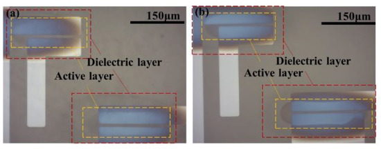 Polarizing microscope images of TFTs with (a) InGaO and (b) InGaSnO semiconductor layers.