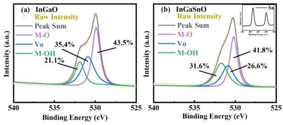 XPS O 1s spectra collected from (a) InGaO and (b) InGaSnO semiconductor layers. Inset: Sn 3d spectrum collected from InGaSnO semiconductor.