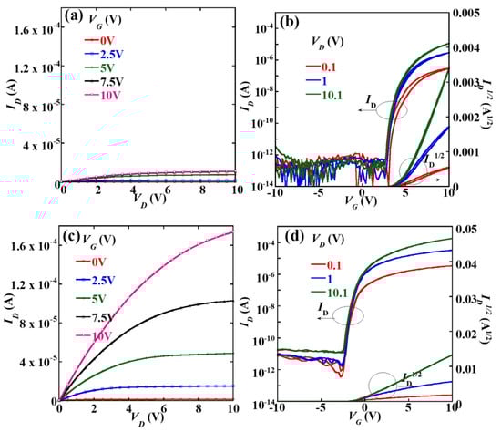 Figure 5 shows the output and transfer characteristics of the printed top-gate InGaO and InGaSnO TFTs. In the output curves, there are no current crowding effects in the linear regime, implying Ohmic contact between the MO semiconductor layer and the S/D electrodes (despite the bottom-contact structure). It is also observed that the output current of the InGaO TFT is much lower and the turn-on voltage (Von) is much higher than that of the InGaSnO TFT, which is attributed to the serious damage of the InGaO film by the corrosive aqueous AlOx precursor ink. The mobility in the saturation region (μsat) is calculated using the following