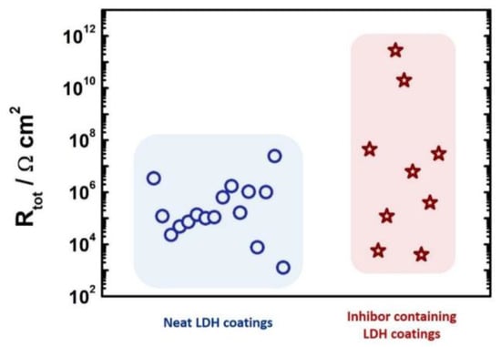 - Tedim, J.; Zheludkevich, M.L.; Salak, A.N.; Lisenkov, A.; Ferreira, M.G.S. Nanostructured LDH-container layer with active protection functionality. J. Mater. Chem. 2011, 21, 15464–15470. [Google Scholar] [CrossRef]