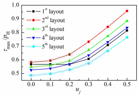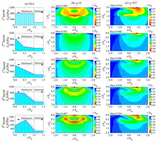 - Among various structure layouts numerically investigated in this paper, the layout with elasticity modulus increasing first in the top layers and then decreasing in the bottom layers can minimize the peak value of the maximum shear stress under various friction coefficients.