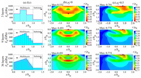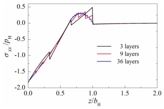 - The maximum tensile stress σxx in subsurface can be reduced effectively by increasing the layer number of multilayered solids.