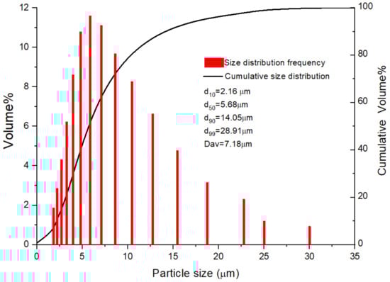 A laser diffraction analyzer (Microtrac S3500, Beituo science and technology, Guangzhou, China) was used to obtain the aluminum particle size and size distribution. The results of D10, D50, D90, D99, and Dav are shown in Figure 1. Figure 2 shows a SEM image of the aluminum particles. The image reveals that the surface of the aluminum particles is compact and smooth. The hydrogen inhibition experimental setup is shown in Figure 3. Sodium tungstate (Na2WO4∙2H2O) was produced by the Tianjin Chemical Reagent Fourth Plant (Tianjin, China).