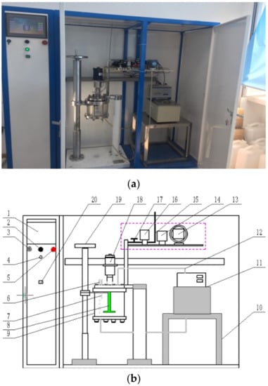 Physical and structural diagram of the hydrogen inhibition experimental setup. 1. Display, 2. USB export interface, 3. Buzzer, 4. Start switch, 5. Emergency brake device, 6. Temperature sensor, 7. Pressure sensor, 8. Mixer, 9. Reaction kettle, 10. Base, 11. High-temperature circulator, 12. Circulating water pipe, 13. Positive pressure pump, 14. Negative pressure pump, 15. Exhaust pipe, 16. Exhaust pump, 17. Release valve, 18. Stir motor, 19. Operation panel, 20. Light. (a) Physical and schematic diagram of the experimental setup; (b) Plan of the setup.