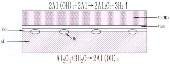 The surface of the aluminum particles exposed to the air is oxidized to alumina. Alumina is very stable and protects aluminum from continuing to react with oxygen. However, after being mixed with the aqueous solution, the alumina and water undergo a hydration reaction, and the outermost layer of alumina reacts with water to form aluminum hydroxide. As the temperature gradually increases to 323 K, more aluminum hydroxide is formed, and the tension of the aluminum oxide coating and the aluminum hydroxide coating is increased. When the tension exceeds the critical tension of the coating, the coating is broken. Then, the exposed aluminum core reacts directly with the aluminum hydroxide, and the generated hydrogen causes the coating to rupture more severely; thus, the water directly reacts with the aluminum core, and the reaction speed is rapidly increased until the aluminum is substantially oxidized with water to aluminum hydroxide and precipitated alumina. The formation process of an aluminum particle hydrate layer can be seen in Figure 5.