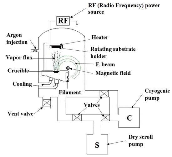 It is possible to achieve high-power densities and high local temperatures using an electron beam. Therefore, this method is ideal for the evaporation of high-temperature oxide materials, e.g., ZrO2, CeO2, HfO2, La2O3, Nb2O5, etc. The modern systems allow controlling the e-beam power which lets us adjust it precisely and achieve any deposition rate of thin films. In comparison, only low deposition rates are possible for oxide materials using the magnetron sputtering technique. On the other hand, physical vapor deposition methods require precise technological condition adjustment in order to obtain thin films of the desired elemental composition. Impurities originating from residual gas in a vacuum chamber during physical vapor deposition can affect the film growth and its properties. During the deposition process, the evaporated particles from the vapor phase arrive at the surface of the substrate. The thin film growing process is complex and consists of several steps: nucleation, island growth, coalescence of islands, formation of polycrystalline islands and channels, development of continuous structure, and thickness growth [21,22,23]. The kinetics of these processes is strongly related to the energy and migration time on the surface of arriving atoms or atom clusters. Consequently, the substrate temperature, the deposition rate, the composition of vapor, and the pressure play a vital role in the deposition process. Due to a large number of variables, the deposition process becomes complex [22,24,25,26].