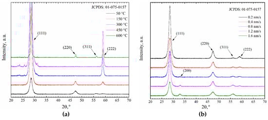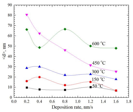 The crystallite size depended on the temperature of the substrate and the deposition rate (Figure 5) and it was higher using substrates of higher temperature during the deposition (9.7–80.6 nm). The deposition rate had little effect on the crystallite size at low deposition temperatures (lower than 300 °C). However, at high temperatures (450 °C and 600 °C) and low deposition rates (lower than 0.8 nm/s), fluctuations of crystallite size appeared.