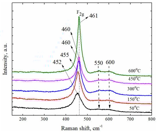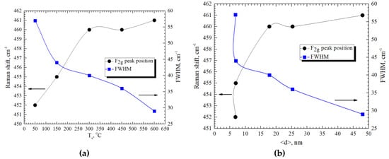 The shifting of F2g peaks increased with increasing substrate temperature (Figure 7a) whereas the full-width at half-maximum (FWHM) of the main peak narrowed, showing that structural reorganization occurred, and higher crystallinity of the thin films was reached. It is known that the temperature of the substrate has an impact on the crystallinity of thin films. Therefore, the same tendency was observed when analyzing the position of F2g peak dependence on the crystallite size (Figure 7b). The authors of [11,31,32,33] noted that the Raman mode at 464 cm−1 is sensitive to a change in the oxygen stoichiometry of CeO2−x due to the size effects. The decrease in the size of CeO2−x nanoparticles leads to systematic changes in the Raman spectra, the shift of the Raman peak to lower energies caused by an increase in the crystal cell parameter of CeO2-x and broadening of the peak determined by inhomogeneous lattice tensions.