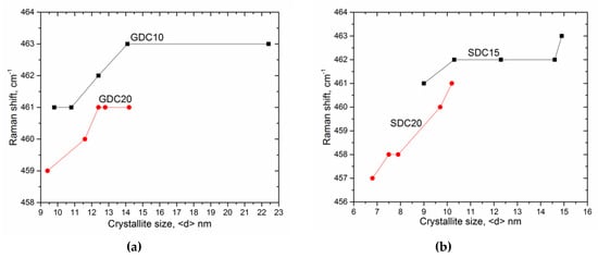 Change of the F2g mode peak position with respect to crystallite size for (a) GDC10, GDC20 samples; (b) SDC15, SDC20 samples.