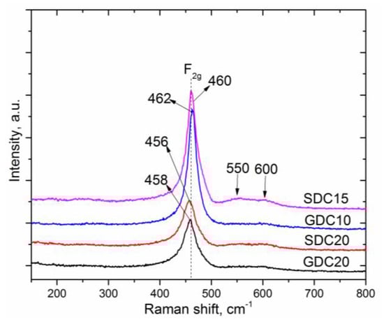 Raman peaks become wider and more asymmetric and that could be influenced by the presence of oxygen vacancies [34]. Peak asymmetry and shift in the F2g mode (Figure 9) can be interpreted by the alteration in M-O vibration frequency after Gd and Sm introduction to the ceria structure. Two supplementary wide peaks appeared at 540–550 cm−1 and 600 cm−1 (Figure 9) because of the oxygen vacancies and were seen in all samples. The peak position at 540–550 cm−1 corresponds to oxygen vacancies, generated as charge compensation defects induced by the introduction of other metal cations into the crystal lattice of CeO2 to maintain the charge neutrality when Ce4+ ions are replaced by Gd3+ ions, which create extrinsic vacancies [29]. The peak position at 600 cm−1 originated due to the non- stoichiometry oxygen vacancy in CeO2 by reducing Ce4+ to Ce3+ [28,29,30,36,37,38,39].