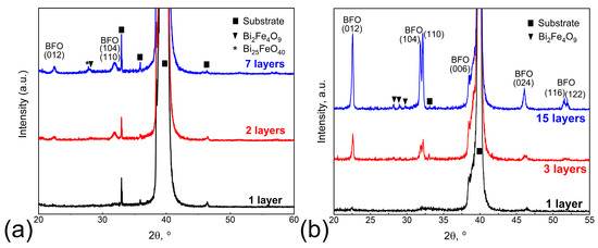 XRD diffractograms of the (a) HTD and (b) LTD BFO thin films with different numbers of the layers.