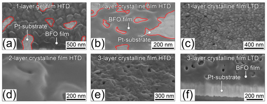 The quality of the films at the large-scale was inspected by the optical microscopy (Figure A1 in Appendix A). The surface was quite homogeneous for all studied thicknesses except of the film with the large number of the layers: 10–15 deposited layers (500–750 nm). This can originate from the gradual decrease of the film quality caused by the sequential deposition of the layers. Nevertheless, the films were shown to be uniform enough for the representative local-scale studies with scanning electron microscopy (SEM). The material contrast between BFO and Pt substrate revealed by the in-lens detector allows clear distinction between the Pt substrate and the film [30] (Figure 2). It is seen that the HTD film deposited in one layer covers the substrate non-uniformly (Figure 2b). The coverage of the surface is an “island-like” with a fraction around 85%. The average thickness of the layer was estimated to be around 30–50 nm, which was measured with the atomic force microscopy from the step at the boundary of the islands. The coverage of the one-layer crystalline film, after 600 °C annealing treatment, was the same as for HTD gel film, after drying and before crystallization (Figure 2a). Oppositely, LTD-prepared films cover the substrate uniformly without any morphological features (Figure 2c). As the substrate preparation was identical for both sets of films, the difference in the BFO coverage can be attributed to the conditions of the drying procedure. Two- and three-layer films were homogeneous without extra inclusions (Figure 2d–f).