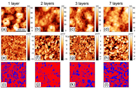 PFM images and phase distribution images in: (a,e,i) one-layer; (b,f,j) two-layer; (c,g,k) three-layer; (d,h,l) seven-layer HTD BFO films. (a–d) Topography; (e–h) vertical PFM images; (i–l) distribution of the piezoelectrically-active (red) and non-active (blue) phases.