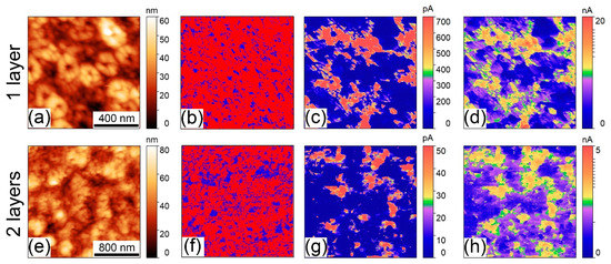 C-AFM measurements of the leakage current in (a–d) one-layer; (b–h) two-layer HTD BFO films. (a,e) Topography; (b,f) distribution of the piezoelectrically active (red) and non-active (blue) phases; (c,g) electrical current; (d,h) electrical current with logarithmic vertical scale.