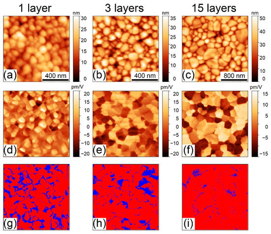 PFM images and phase distribution images in: (a,d,g) one-layer; (b,e,h) three-layer; (c,f,i) 15-layer LTD BFO films. (a–c) Topography; (d–f) vertical PFM images; (g–i) distribution of the piezoelectrically-active (red) and non-active (blue) phases.