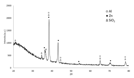 XRD analysis was also performed on the sample obtained at 2.3 A/cm2 for 2 min. The XRD pattern is reported in Figure 4. It can be noticed the presence of the peaks of aluminum (PDF-2 database, reference N°000040787) and zinc (PDF-2 database, reference N°000040831) coming from the ZA layer, due to the penetration of X-rays under the PEO layer. From the observation of the XRD pattern, amorphous phases were present in the PEO layer, as typical for this kind of coatings [26]. Considering the crystalline part, the PEO layer resulted mainly composed by SiO2 (PDF-2 database, reference N°000821573), in accordance with the composition of the electrolyte that was a silicate-based one. Comparing the results of EDS elemental mapping (Figure 3) and XRD (Figure 4), it is reasonable to think that the amorphous part is mainly composed by an [Al–Si–O] phase. The presence of this kind of phase, like mullite but amorphous, is also in accordance with what found by Guan et al. [27].