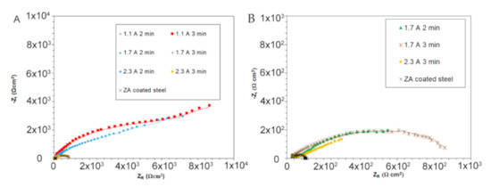 In analyzing the Nyquist plots, reported in Figure 6A, it resulted that the samples treated at 1.1 A/cm2 for 3 min and the one treated at 2.3 A/cm2 for 2 min were characterized by improved corrosion resistance in comparison with all the other samples. In fact, considering the width of the semicircle and the intersection with the X-axis as qualitative evaluation of the polarization resistance Rp, an increase of more than one order of magnitude in the polarization resistance of these two samples in comparison with the others can be observed. Observing the Nyquist plots of all the other samples (Figure 6B), an increase in the polarization resistance of all the PEO-treated samples in comparison with the only ZA one was recorded. The quality of the fitting was positive, as can be observed from the good agreement between experimental and fitting data and from the low chi-squared values.