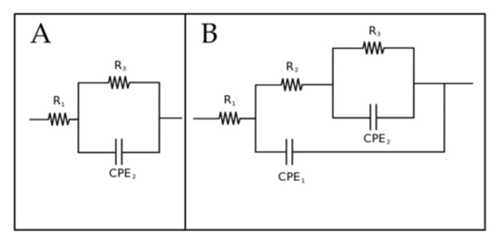 Equivalent circuits employed to fit EIS data for the ZA coated sample, with the circuit that represents the natural oxide film on the surface (A) and for the PEO treated samples, with the two circuits that represent the inner and external layers of PEO coating (B).