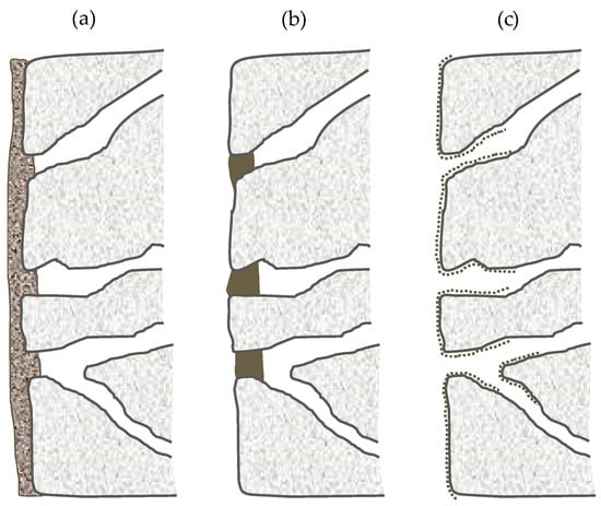 Figure 3. Typologies of hydrophobic surface treatments on concrete: (a) coating; (b) pore blockage; and (c) impregnation.