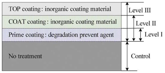 The coating layer can have different thicknesses and can be applied with various methods. In the study carried out by Moon et al. [30], three coatings were sprayed onto the mortar specimens: a primer as anti-deteriorating agent and two different inorganic coatings (Figure 5). Acrylic silicone mixture was applied as an outer layer and metal silicates as inner layers. The concrete with the surface treatment applied to level III exhibited the most remarkable characteristics in terms of chloride penetration and carbonation progress delay. This is reasonably the consequence of a defect decoupling occurring when multiple barrier layers are utilized.