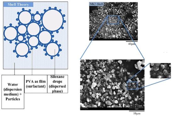 Figure 6. Shell scheme utilized to design a type of polymethylhydroxysilane (PMHS) emulsions in Flores-Vivian et al. [31] with the corresponding SEM images at a different magnification of the resulting coating. PVA, polyvinylalcohol.