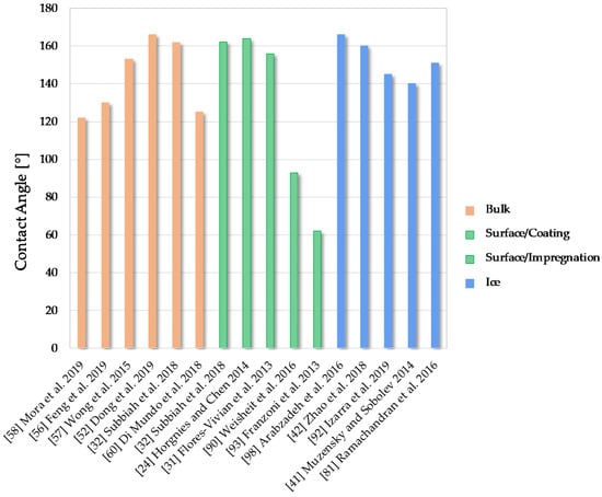 These contents are found in the following Section 2, with specific reference to their composition (compounds, solvents). In Section 6, all the performances related to water interaction/ingress are separately collected in order to provide a quick functional overview. In Section 3 and Section 4, bulk modifications and sustainable approaches are presented, respectively. In Section 5, we also present an overview on icephobic (and anti-icing) surface treatments and the specific meaning they take when dealing with concrete; this material, indeed, has an inherent high content of moisture (owing to the well-known phenomenon of capillary condensation), and therefore speaking of icing alone as a surface phenomenon is too restricting. Hydrophobic surface treatments have been recently tested, sometimes as icephobic and anti-icing treatments, and their performances are discussed.
