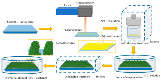 In this work, we used a Nd:YAG pulsed laser with a wavelength of 1064 nm and a pulse width of 100 ns. The spot size of the laser was 0.1 mm. The scanning speed, average laser power, and repetition frequency were set at 500 mm/s, 15 W, and 20 kHz, respectively, during the process. Prior to the laser texturing, the Ti alloy sheets were cleaned with ethanol and deionized water in an ultrasonic bath for 10 min sequentially and dried in air. Then, the Ti alloy sheets ablated by laser were transferred into a Teflon-lined autoclave containing 1.0 mol/L NaOH solution with 40 mL for hydrothermal treatment and the temperatures were set as 150, 170, 190, and 210 °C, respectively. After the hydrothermal reaction for 24 h, the obtained samples were immersed in a 0.8 mol/L HCl solution for 2 h by ion exchange reaction. Subsequently, the Ti alloy sheets were rinsed with deionized water and dried entirely. Then, the samples were subjected to annealing treatment at 300 °C for 3 h for the purpose of dehydration and annealing. Finally, to achieve the superhydrophobic surfaces, all samples were modified with 2 wt % solution of FAS-17/ethanol at ambient temperature for 6 h and well dried. A schematic diagram of the entire sample preparation process is shown in Figure 1. In addition, control samples were prepared. Control sample 1 is the substrate that was only processed by laser. Control sample 2 is the substrate without pre-treatment of laser ablation, which was only treated by hydrothermal reaction, ion exchange reaction, and annealing treatment with the same process. All control samples were covered with FAS-17.