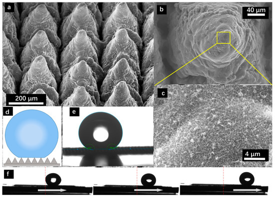 The large-area SEM images of the surfaces of the micro/nano-hierarchical structures with micro-conical arrays synthesized by the combination of laser process and hydrothermal reaction at 150 °C are shown in Figure 2a–c. It can be seen that a large number of small micro-conical array structures with the same sizes were evenly located on the as-prepared sample surface (Figure 2a), and those cones were similar to the micro-structure pattern of the surface of the pansy petal [12]. A closer examination revealed that micro-cones were vertically located in the as-prepared substrate with diameters of about 200 μm at the bottom. The micro-conical array structure was produced by laser ablation. When the nanosecond pulsed laser hits the surface of the target material, a large number of photons are absorbed by the electrons of the TC4 substrate and transferred to the crystal lattice in a short time (~picosecond level), causing thermal diffusion and raising the temperature of the target material, leading to heating, melting, and evaporation [31]. The heat-affected zone can change the surface morphology by recasting and formation of burrs. In laser ablation, compressive forces can be created by the vapor and plasma plume at the focus point, leading to the expulsion of a molten pool of materials [32]. A portion of the liquefied material is resolidified after pressed out of the ablation zone, and accumulates and covers the surrounding non-processed areas, eventually forming a conical structure. Figure 2b is the top-view SEM image of the micro-conical structure. With further investigation, it can be observed that the surface was covered by many nanoscale flocculent structures, as shown in Figure 2c. These flocculent structures are synthesized by the hydrothermal reaction and are composed of layered unit cells. The crystalline structure of the flocs can be described with a representative TiO6 octahedral. During the alkali-hydrothermal process, the laser processed titanium alloy reacts with the NaOH solution at 150 °C in the autoclave, where some of the Ti–O–Ti bonds are broken and form the six-coordinated monomer [Ti(OH)6]2−, which can form polynuclear complexes by olation or oxolation, depending on the concentration of the solution at different temperatures. Under the hydrothermal process, the solution is in a saturated state; hence, the [Ti(OH)6]2− is unstable and tends to combine via oxolation or olation, forming original nuclei [33,34]. As these nuclei grow and exceed the critical nuclei size, they become stable. Small and thin flocs can be formed when the growth continues [33]. Eventually, it can be observed that the micro/nano-hierarchical structures were successfully fabricated on the Ti alloy sheet surface. The surface of the Ti alloy is initially hydrophilic since the Ti alloy is a kind of material with high surface energy. According to the surface structural influence on the surface wettability, the surface structure can make a hydrophilic surface more hydrophilic, and a hydrophobic surface more hydrophobic. Thus, the surface of the Ti alloy with micro/nano-hierarchical structures becomes a superhydrophilic surface. Micro-structure and low surface energy are both prerequisites to achieve surface superhydrophobicity [35]. Therefore, in order to obtain superhydrophobic surfaces, samples were immersed inside the FAS-17 solution for low surface energy modification. After the treatment, the water droplet exhibited a spherical shape on the sample surface with a contact angle of approximately 160° ± 2°, as illustrated in Figure 2e. Furthermore, the as-prepared surface was very slippery and it was easy for the water droplets to slide off with an inclination angle of less than 1°, which is shown in Figure 2f. This indicates that the solid–liquid wetting model between the water droplet and the sample surface is in Cassie–Baxter state, as shown as Figure 2d.