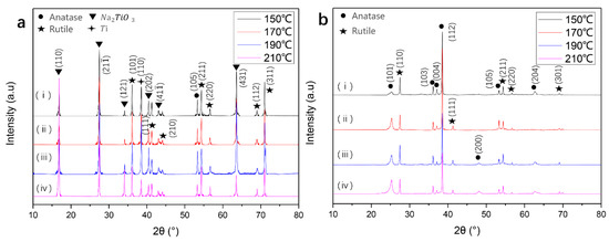 By increasing the temperature from 150 to 210 °C, the intensities of the (110) and (121) peaks increased, indicating the gradual enhancement in the crystallinity of the as-prepared Na2TiO3 nanostructures. After soaking and washing in HCl solution, the Na+ ions were replaced by H+ ions to produce H2TiO3 nanostructures, corresponding to Equation (2).