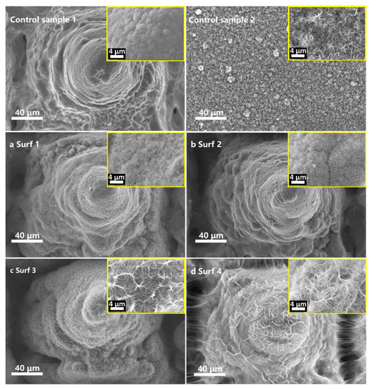 Control sample 1 is the sample only treated by laser processing. Control sample 2 is the sample only treated by hydrothermal treatment, where the hydrothermal temperature was 190 °C. (a–d) SEM images of the hydrothermal reaction Ti alloy surfaces after laser ablation with a magnification of 500x. The hydrothermal temperature is (a) Surf 1: 150 °C; (b) Surf 2: 170 °C; (c) Surf 3: 190 °C; (d) Surf 4: 210 °C. Inset images is at the magnification of 5000x.
