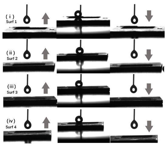 Surface water droplet adhesion test corresponding to different hydrothermal temperatures of micro/nano hierarchical structures: (i) Surf 1: 150 °C; (ii) Surf 2: 170 °C; (iii) Surf 3: 190 °C; (iv) Surf 4: 210 °C.