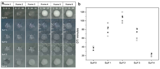 The anti-icing property of the as-prepared surfaces was investigated by the in-house platform. Figure 6a shows the photographs of the icing process of deionized water droplets on the as-prepared surfaces. Surf 0 is the control sample 1 where the surface was only processed by laser. Initially, the reference droplets on all surfaces were transparent (Frame 1). Then, it was observed that the droplet on Surf 4 became non-transparent after ~17 min (frame 2), which indicated that the droplet was frozen. After ~34 min (frame 3), the droplet on Surf 0 became non-transparent. In contrast, the droplets on other textured surfaces were still transparent. Then, after ~95 min (Frames 5 and 6), all the water droplets on the rest of surfaces were frozen. This implies that these surfaces (e.g., Surf 1, Surf 2, and Surf 3) had a relatively long time to resist the water freezing. Obviously, the micro/nano-hierarchical structure synthesized by the collaborative effect of laser processing and hydrothermal treatment at a suitable temperature can effectively enhance the surface anti-icing property, in comparison with the sample processed only by laser. Water droplets need to lose heat to be frozen. When the temperature of a water droplet decreases below the freezing point, the molecules of water tend to bond in an orderly arrangement to form an ice nucleus and be frozen. During the anti-icing characterization, the water droplet loses heat to the samples’ surface. According to the analysis of structural characteristics, the nanostructures synthesized by hydrothermal treatment take up a part of the surface layer and a lot of air is trapped in the nanostructure to form air bags [38,39]. Thus, the water droplet is suspended up onto the micro-cone with nanostructures to decrease the wetting contact with the solid surface. These air bags rarely occur on surfaces with only micro-structures. Therefore, on the surface of the micro/nano-hierarchical structure, the water droplets isolated by the air bags find it more difficult to transfer the heat to the surface of the sample, resulting in the prolonged freezing time of water droplets.