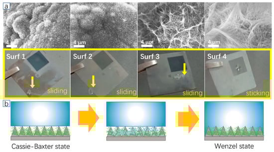 Assuming that the water droplet on the as-prepared surfaces lose the same amount of heat to air, the contact heat conduction from water droplets to the sample surfaces is the key factor affecting the DT of droplets. Thus, the solid–liquid contact area is the key factor affecting the contact heat conduction, influencing the DT of droplets. The effect of different morphologies on the solid–liquid contact area is further investigated by observing the contact states of various surfaces with water droplets after cooling. After placing all the micro/nano-hierarchical structure samples at −5 °C for 3 min, it was observed that the water droplet on Surf 4 was firmly adhered to the surface, but the water droplets on other surfaces easily rolled off, as shown in Figure 7a, indicating that the superhydrophobic state of Surf 4 may change from a Cassie–Baxter state to a Wenzel state in 3 min, while Surf 1–3 still maintained a Cassie–Baxter state. This may be due to the condensation of the humidity on the surface, which occurred at low temperature. Surf 4 seems to have a much larger surface area than the other samples (because it was covered with numerous nanowires, as shown in Figure 4), which increased the number of van der Waals interactions between the vapor phase molecules inside the confined spaces and is more exposed to the water capillary condensation phenomenon that leads to the loss of the Cassie–Baxter state, allowing water droplets to penetrate into the surface and forming “sticky” drops. When Surf 4 was subsequently tilted, the droplet remained adhered without rolling-off behavior [42]. This greatly increased the solid–liquid contact area (as shown in Figure 7b), enhancing the heat dissipation efficiency of the liquid and causing the water droplets on the surface to freeze more easily. Accordingly, it was observed that , where is the duration to sustain the Cassie–Baxter state before state transition at low temperature, resulting in , as shown in Figure 6b. Consequently, the structural differences of the superhydrophobic surface can significantly impact delayed freezing time. The capability of the as-prepared surfaces to maintain the superhydrophobic Cassie–Baxter state determines the delayed freezing time. Although the micro/nano-hierarchical structures can effectively delay the freezing time, water droplets are more likely to penetrate into the structure and accelerate freezing while the nanowire structure dominates the surface morphology.