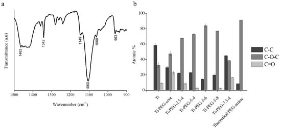 The ATR-FTIR spectra were recorded for all of the conditions giving similar results. Figure 2a shows a representative spectrum, which presented the characteristic peaks for a PEG coating. The main peaks were attributed to –CH2 bending at 963, 1342, 1455, and 1465 cm−1, to C–O stretching at 1106 and 1060 cm−1, and to C–C stretching at 1149 cm−1.