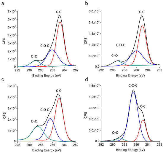 High resolution XPS spectra of the C 1s signal with the peak decomposition, corresponding to Ti (a), Ti_PA (b), Ti_PEG_cont (c), and Ti_PEG_5_4 (d).