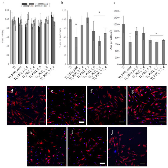 Indirect cytotoxicity of the PEG-coated samples (a), % area covered by cells (b) and area per cell (c). Samples with the same symbol have no statistically significant differences p < 0.05) (c). Cell adhesion on the samples: Ti (d), Ti_PEG_cont (e), Ti_PEG_2.5_4 (f), Ti_PEG_5_4 (g), Ti_PEG_5_6 (h), Ti_PEG_5_8 (i), and Ti_PEG_7.5_4 (j). Scale bar indicates 100 µm.