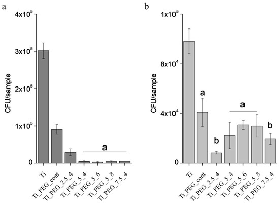 The first goal of this study was to detect the presence of PEG on titanium and analyze whether any differences were obtained when comparing the different parameters. Indeed, the physicochemical characterization confirmed the presence of a polymeric coating on all treated samples. For instance, the water contact angles that were measured for PEGylated samples were statistically different than for plain and plasma-activated titanium controls (Figure 1a) and they were in the range of wettability previously found for other PEG coatings [51,52]. The fact that no statistically significant differences were found in the average roughness (Ra) values of titanium and the PEG coated samples indicated that the coatings did not modify the morphology of the samples. In addition, it has been reported that bacterial adhesion is not affected by the surface roughness below a threshold Ra value of 200 nm [53,54]. Thus, working with smooth samples allowed for us to exclude the effect of roughness and correlate the in vitro data unequivocally to the effects of the PEG coatings. Moreover, the ATR-FTIR measurements also confirmed the presence of the polymer, which showed the characteristic peaks of PEG [55]. XPS analysis proved useful in studying the differences among the treatments. The values of atomic composition (C 1s, O 1s, and N 1s) of the PEG layers that were obtained by pulsed electrodeposition were comparable to the theoretical values for an amino-terminated PEG with a molecular weight of 1500 (Table 2). In contrast, electrodeposition using the standard method failed to reproduce these values, thus showing the higher yield of coating obtained with the pulsed process when compared to the continuous one. Differences on the nitrogen amount may be due to the depth analysis of XPS, since the polymer layers are thicker than the analysis depth and part of the nitrogen is expected to be in contact with the titanium substrate and, hence, undetectable for the XPS.