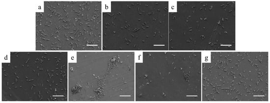 Representative SEM images of E. coli adhering to Ti (a), Ti_PEG_cont (b), Ti_PEG_2.5_4 (c), Ti_PEG_5_4 (d), Ti_PEG_5_6 (e), Ti_PEG_5_8 (f), and Ti_PEG_7.5_4 (g). Scale bar represents 10 µm.
