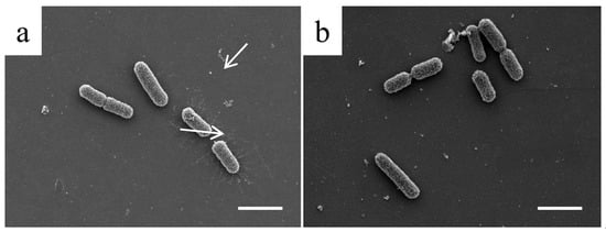 Magnified SEM images of E. coli adhesion on Ti (a) and Ti_PEG_5_4 (b), showing the presence of fimbriae in the bacteria adhered on the Ti sample (white arrows), but not on the Ti_PEG_5_4 sample. Scale bar represents 2 µm.