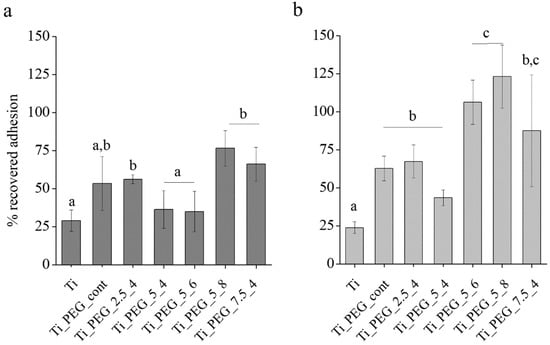 Finally, the capacity of the coatings to support hFFs adhesion under a “pre-infective” scenario was investigated with cell-bacteria co-culture assays. Figure 9 shows the % of area covered by cells for each treatment with respect to hFFs adhesion for the same condition without bacteria (i.e., % of recovered adhesion). Thus, this graph illustrates the capacity of the coatings to effectively “rescue” eukaryotic cell adhesion. Interestingly, on control Ti, the presence of bacteria was accompanied by a strong decrease in hFFs adhesion, reaching only ~25% of the original values. In contrast, the PEG coatings generally increased the area covered by cells up to 50% or more, demonstrating their potential to overcome bacterial infection while allowing a certain degree of eukaryotic cell adhesion. By contrasting the performance of the different conditions that were studied against the two bacterial strains, Ti_PEG_5_8 is the condition showing a higher cell colonization recovery.