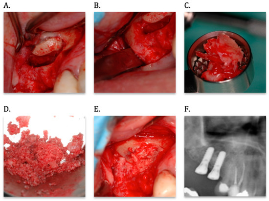 Maxillary sinus floor elevation (MSFE) procedure using a mixture of autogenous bone from the maxillary tuberosity and a biphasic calcium phosphate (BCP). (A) The preparation of the top hinge door in the lateral window of the right maxillary sinus. (B) Harvesting of an autogenous bone graft from the maxillary tuberosity with a chisel at the same surgical side and during the same procedure. (C) The harvested bone graft is grinded in smaller pieces by means of a bone mill. (D) The milled bone graft is mixed with a biphasic calcium phosphate (Straumann® Bone Ceramic 60:40). (E) Area between the lifted lid and the maxillary sinus floor is filled with the mixed bone graft. (F) Radiograph taken directly after the insertion of two Straumann® SLA dental implants in the augmented right posterior maxilla (6 months after MSFE).