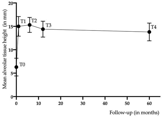 According to the same study protocol as previously reported [12,46], panoramic radiographs were taken at patient’s intake (T0); immediately after the MSFE procedure (T1); immediately after dental implant placement (T2); 1 year after dental implant placement (T3) and 5 years after dental implant placement (T4). On the panoramic radiographs changes in tissue height (mm) of the grafted area were measured at the implant sites on all time points. An average magnification of 1.25 was taken into account to calculate the actual tissue heights.