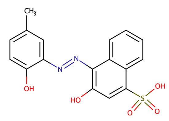 For this purpose, an indicator has been searched that fulfills both conditions and can be immobilized on the membrane surface. Calmagite is an indicator for metal cations with the molecular formula presented in Figure 1. The operating principle of this indicator is based on the complexation reaction of metal cations generated by the two hydroxyl groups and the two nitrogen atoms [37]. The novelty degree of this research is given by the fact that without additional instrumental analysis methods, the efficiency of separation can be observed visibly by the operator through the change of color of the membrane surface.