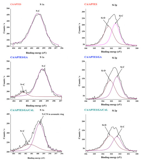 In Figure 8, deconvoluted spectra for N 1s show the presence of N–C bonds in CA/APTES, CA/APTES/GA, respectively CA/APTES/GA/CAL, at 399 eV and N=C bonds in CA/APTES/GA and CA/APTES/GA/CAL samples, at 402 eV [52]. Related to deconvoluted spectra for Si 2p, we can observe Si–O (at 103 eV) and Si–C bonds (at 102 eV) from APTES used as linkers and present in CA/APTES, CA/APTES/GA, and CA/APTES/GA/CAL samples [53].