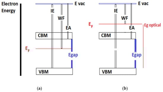 To discuss, develop and engineer the making of these materials it is vital that the mechanism by which these materials demonstrate transparency and conductivity is well-understood and can be repeated during experimental trials. The mechanism by which the bandgap of these materials is specifically altered is referred to as the Moss-Burstein shift, which in simple terms refers to widening the optical bandgap of the material. The Fermi level, work function, ionization energy, energy gap, and electron affinity are fundamental parameters that need to be addressed when discussing TCOs [9]. These parameters define the electronic interface between the TCO surface and other materials and control the charge exchange and transport across these materials. Figure 1 illustrates a simple energy diagram of a semiconductor exhibiting the above-mentioned parameters.